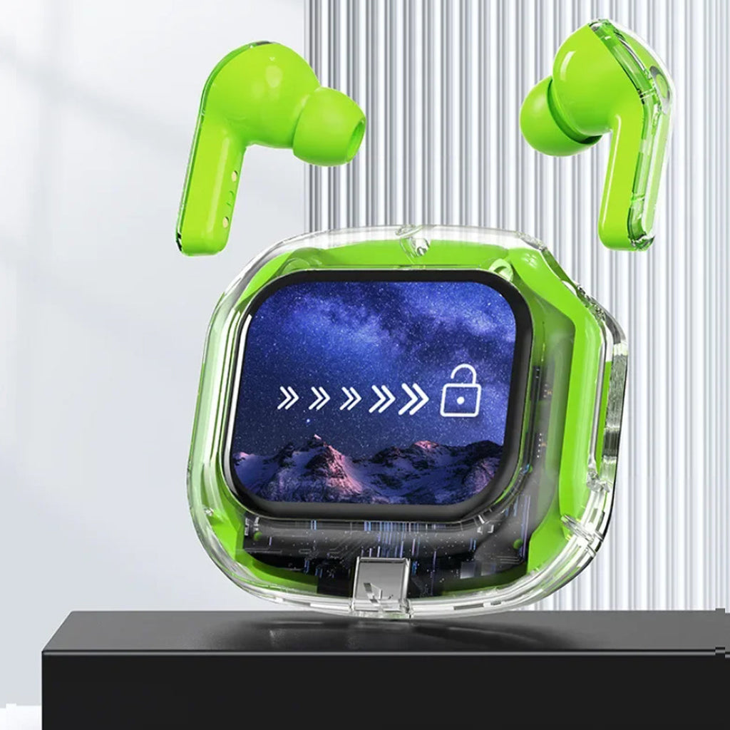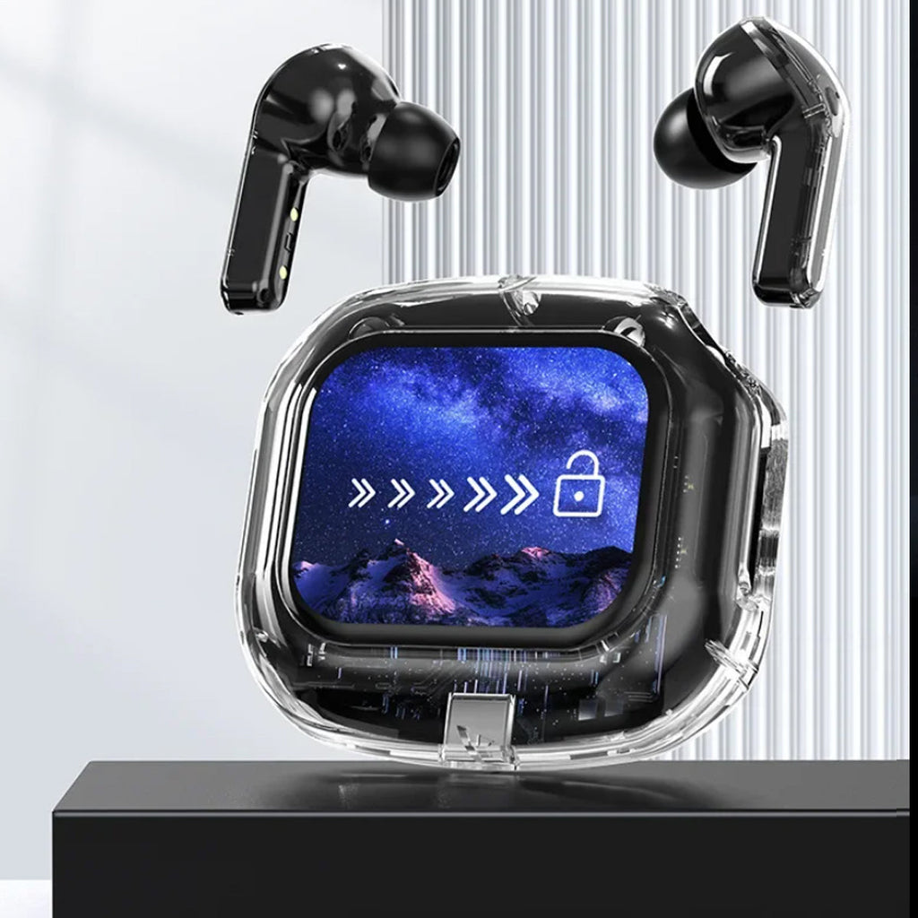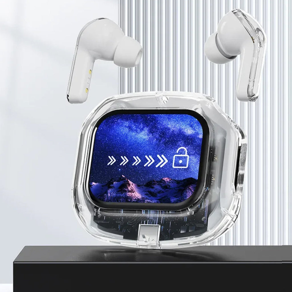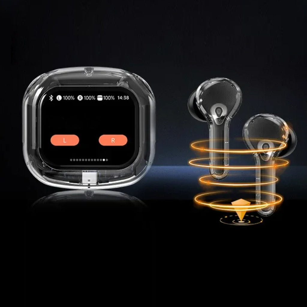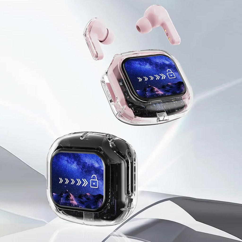Experience next-gen audio with these futuristic, transparent wireless Bluetooth headphones, featuring a sleek touch screen and digital display. With many benefits and stylish appeal, its elegant, futuristic interface lets you control volume, playback, and modes with just a tap. No buttons, no hassle — just smooth touch navigation. Open the case, and you’re instantly connected, enabling seamless syncing with Android & Apple devices. You can enjoy deep bass, crisp highs, and an immersive stereo sound experience. Engineered for both music lovers and audiophiles. The real-time power level is displayed on the digital screen, so there's no more guessing how much juice is left. It is also designed with a faster, stronger, and more stable connection, featuring ultra-low latency, which is ideal for music, gaming, and video. It's built-in mic with noise-reduction feature keeps your voice sharp and clear during calls or voice commands. Ergonomic and secure for active use as well, whether you’re at the gym, running, or on the move.