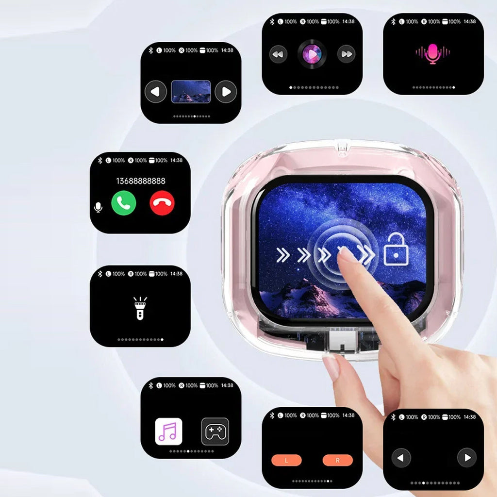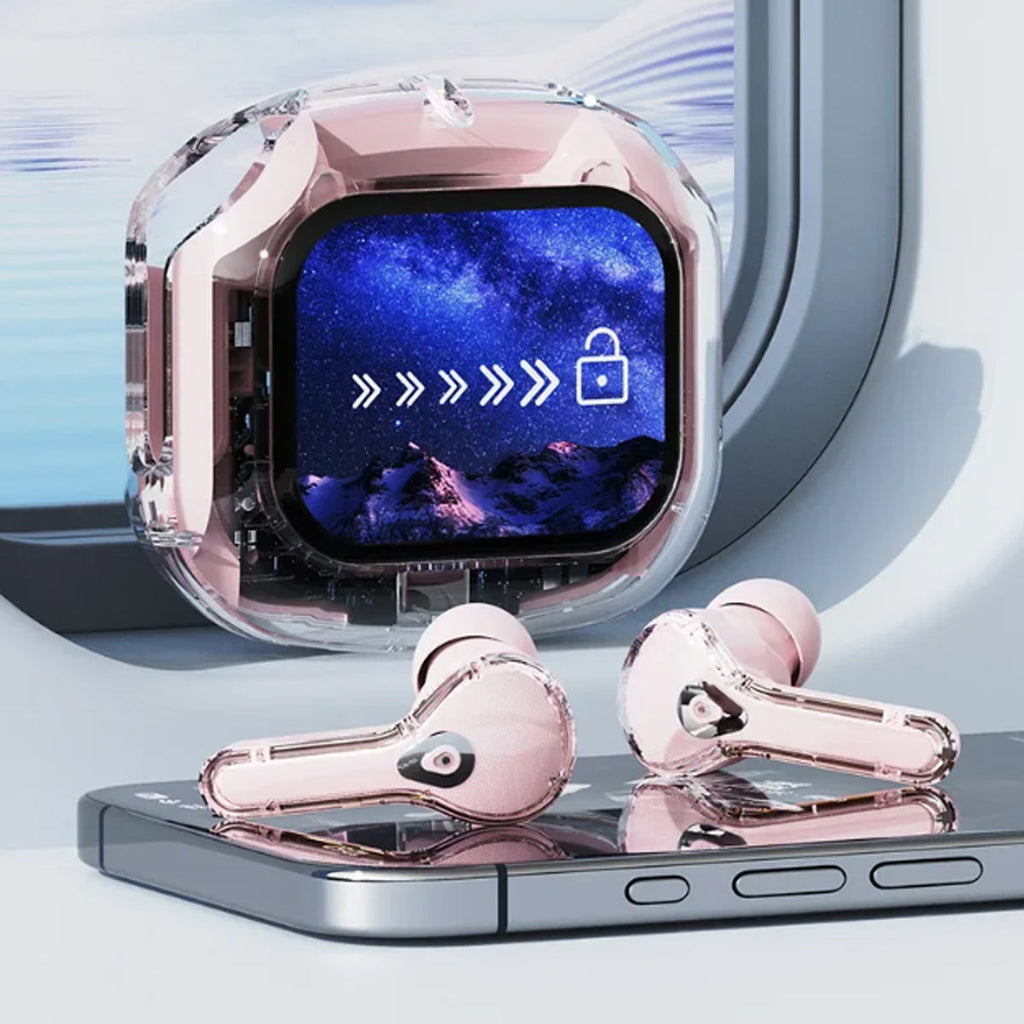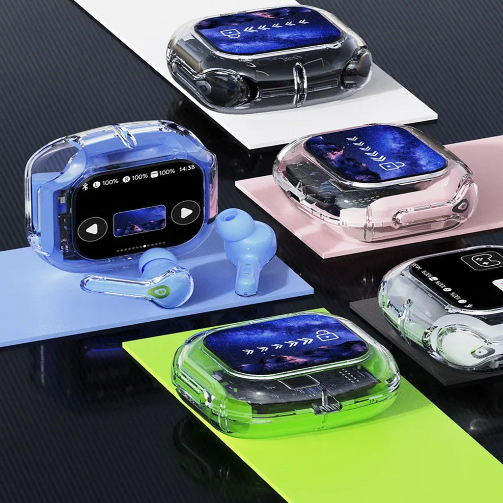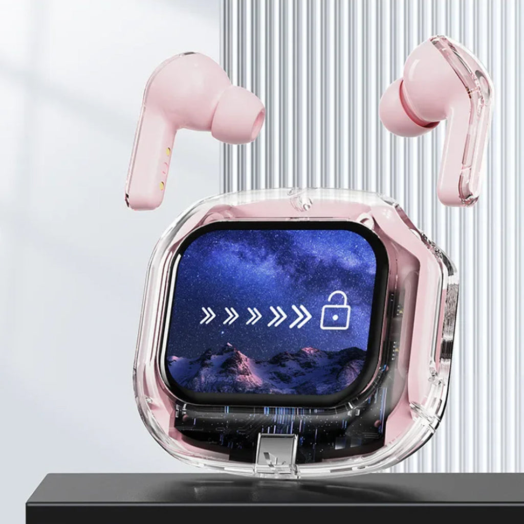 Experience next-gen audio with these futuristic, transparent wireless Bluetooth headphones, featuring a sleek touch screen and digital display. With many benefits and stylish appeal, its elegant, futuristic interface lets you control volume, playback, and modes with just a tap. No buttons, no hassle — just smooth touch navigation. Open the case, and you’re instantly connected, enabling seamless syncing with Android & Apple devices. You can enjoy deep bass, crisp highs, and an immersive stereo sound experience. Engineered for both music lovers and audiophiles. The real-time power level is displayed on the digital screen, so there's no more guessing how much juice is left. It is also designed with a faster, stronger, and more stable connection, featuring ultra-low latency, which is ideal for music, gaming, and video. It's built-in mic with noise-reduction feature keeps your voice sharp and clear during calls or voice commands. Ergonomic and secure for active use as well, whether you’re at the gym, running, or on the move.