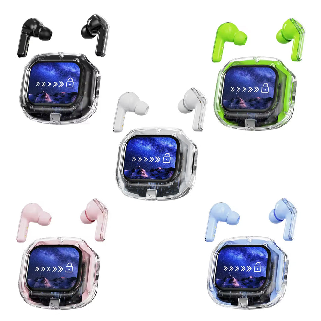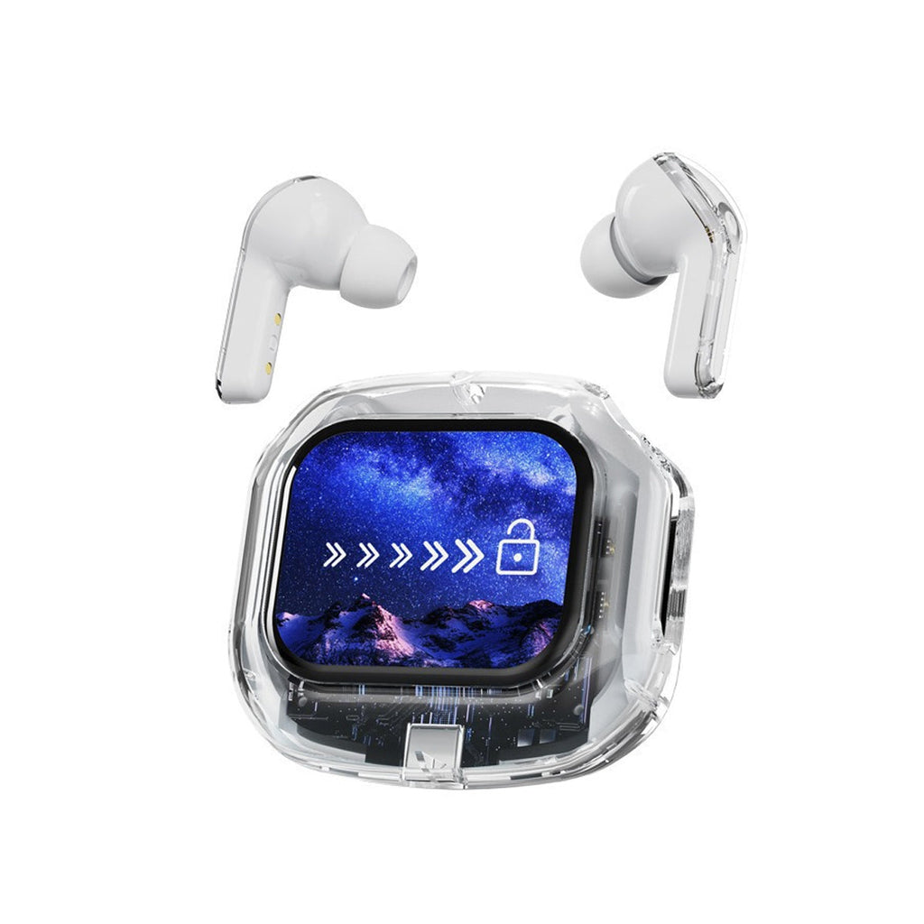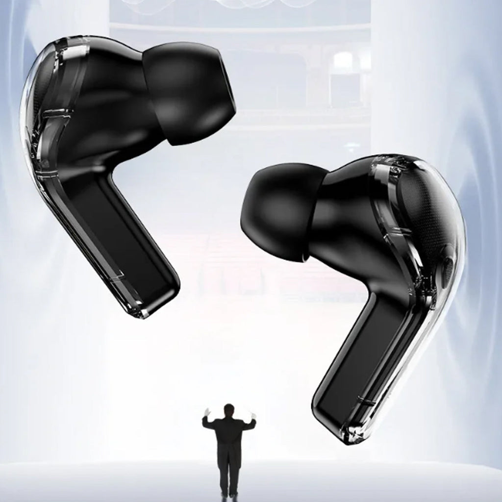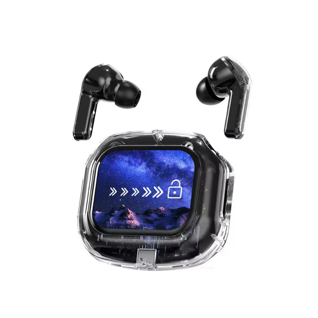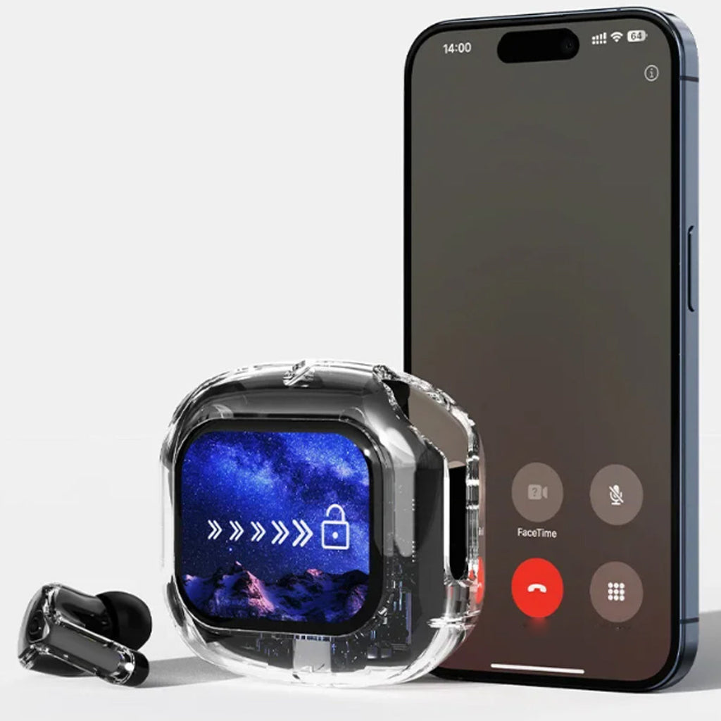 Experience next-gen audio with these futuristic, transparent wireless Bluetooth headphones, featuring a sleek touch screen and digital display. With many benefits and stylish appeal, its elegant, futuristic interface lets you control volume, playback, and modes with just a tap. No buttons, no hassle — just smooth touch navigation. Open the case, and you’re instantly connected, enabling seamless syncing with Android & Apple devices. You can enjoy deep bass, crisp highs, and an immersive stereo sound experience. Engineered for both music lovers and audiophiles. The real-time power level is displayed on the digital screen, so there's no more guessing how much juice is left. It is also designed with a faster, stronger, and more stable connection, featuring ultra-low latency, which is ideal for music, gaming, and video. It's built-in mic with noise-reduction feature keeps your voice sharp and clear during calls or voice commands. Ergonomic and secure for active use as well, whether you’re at the gym, running, or on the move.